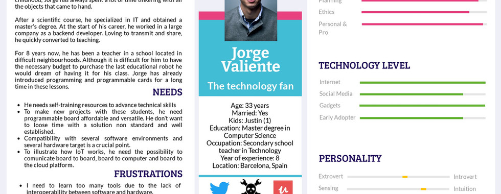 This questioning led to a strong work done by our team technical within the deliverable D1.3. The analysis of the specifications developed within deliverable D1.2 made it possible to understand the adaptations necessary to be done on these open source solutions to better fit the needs of the teachers once trained and to concretely apply the methodology promoted within their classes. As a reminder, our long-term objective is to validate the usefulness of our educational approach with the students. During the work carried out to build-up these functionalities, the partners translated the results of the study carried out by ARGET into " persona " used to personify the process of technical development.